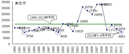 經(jīng)濟復(fù)蘇乏力或內(nèi)生動力不足直接對全球政治、軍事、民生、金融等產(chǎn)生極其不利影響,使從來沒清澈過的地球村變得更為渾濁,發(fā)展前景變得更為不確定性,對本已十分低迷的航運市場形成新的壓力與沖擊,直接把今年國際航運業(yè)拖入了歷史罕見的冰點。2012 年1-9月克拉克松航運綜合費率平均水平跌破1萬美元/天關(guān)口,與1992年和1999年水平相當(dāng);BDI平均點數(shù)下跌至907點,創(chuàng)出1999年以來的新低。