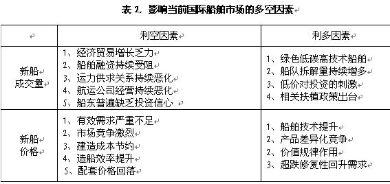在外圍經(jīng)濟和航運市場環(huán)境再度惡化的情況下,年初以來國際船舶市場新船成交量和價格仍舊延續(xù)上年下跌態(tài)勢,但需求結(jié)構(gòu)變化仍為行情發(fā)展提供了新的機遇與氣象。從發(fā)展態(tài)勢來看,影響市場的消極因素仍然占據(jù)主導(dǎo)地位,短期內(nèi)蕭條的行情狀態(tài)不會發(fā)生根本變化,如果航運與造船市場能在今年完成充分觸底的話,來年行情定會出現(xiàn)修復(fù)性反彈(談不上“復(fù)蘇”),但不管市場好轉(zhuǎn)與否,滯后性決定船舶行業(yè)經(jīng)濟運行情況可能更為糟糕。