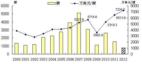 圖4. 2000-2012年成交量(艘)與單船平均成交金額變化