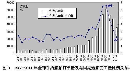 統(tǒng)計(jì)數(shù)據(jù)已顯示,按世界實(shí)際造船能力等同當(dāng)年產(chǎn)量測(cè)算,當(dāng)前世界造船能力至少已經(jīng)達(dá)到1.59億載重噸(2011年產(chǎn)量),但是,如果考慮到近兩年訂單未交付情況,全球?qū)嶋H船舶建造能力要遠(yuǎn)高于此數(shù)。隨著世界經(jīng)濟(jì)調(diào)整的持續(xù)、航運(yùn)市場(chǎng)運(yùn)能嚴(yán)重過(guò)剩的深化和全球新船需求的大幅萎縮,世界造船業(yè)已出現(xiàn)很糾結(jié)的局面,即前期積聚的巨量手持訂單和產(chǎn)能集中釋放仍在不斷推高造船完工量,與新船成交量遠(yuǎn)低于同期造船完工量所導(dǎo)致手持訂單快速萎縮和越來(lái)越多船廠已經(jīng)或即將面臨開工不足局面之間的矛盾日益深化。