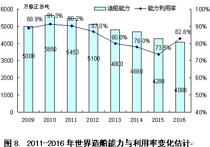 筆者認(rèn)為,這種矛盾最終會(huì)通過(guò)造船能力的逐漸萎縮和產(chǎn)能利用率下降的形式表現(xiàn)出來(lái)。據(jù)英國(guó)克拉克松公司估計(jì),2011-2016年期間全球造船能力將縮減28%,并且,在此基礎(chǔ)上全球造船能力利用率于2015年下滑至階段性低點(diǎn)73.5%,然后于2016年開始出現(xiàn)回升。為此,筆者認(rèn)為,同處于產(chǎn)能萎縮和能力利用率下降的階段,新船價(jià)格有效反彈或回升缺乏最基本的支撐,更何況,處于世界造船業(yè)去產(chǎn)能化初期階段的2012年,價(jià)格回升的可能性的概率極低。