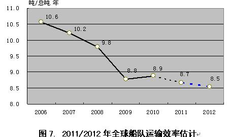 就2012年走勢(shì)看,衡量運(yùn)力供求關(guān)系變化的一個(gè)核心指標(biāo)――船隊(duì)運(yùn)輸效率,即每總噸運(yùn)力年運(yùn)輸貨物量(噸/總噸.年),仍在走低。筆者主要結(jié)合2012年運(yùn)力和海運(yùn)量預(yù)計(jì)的增長(zhǎng),大體估算如下:船隊(duì)增長(zhǎng)方面,結(jié)合可能的訂單交付量和拆解量,估計(jì)到2012年底全球船隊(duì)保有量將達(dá)到11.046億總噸,較2011年增長(zhǎng)6.6%;海運(yùn)量增長(zhǎng)方面,取2011年的增速(IMF對(duì)2011年和2012年世界經(jīng)濟(jì)增速預(yù)測(cè)都為4.0%),估計(jì)2012年全球海運(yùn)總量將達(dá)94.3億噸;如此一來(lái),即使不考慮船隊(duì)降速行駛的情況下,2012年全球船隊(duì)運(yùn)輸效率將由2011年的8.7(噸/總噸.年)下降至8.5(噸/總.年),某種程度上表明2012年全球航運(yùn)市場(chǎng)運(yùn)力供求關(guān)系仍朝惡化態(tài)勢(shì)方向發(fā)展。假設(shè)上述分析成立,2012年國(guó)際航運(yùn)費(fèi)率估計(jì)仍會(huì)處于低位水平,船東經(jīng)營(yíng)狀況也不會(huì)有好的表現(xiàn),船東新造船投資信心和欲望估計(jì)也難被有效調(diào)動(dòng)。