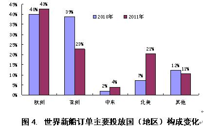 統(tǒng)計(jì)表明,大部分國(guó)家和地區(qū)2011年新船投資量出現(xiàn)大幅度下滑,表現(xiàn)特別顯著有法國(guó)、荷蘭、意大利、俄羅斯、比利時(shí)、中國(guó)、日本、韓國(guó)、中國(guó)臺(tái)灣、馬來(lái)西亞、印度、阿聯(lián)酋等,其中,中資背景船東在2010年投資總量達(dá)到450艘、146億美元,位居世界首位,然而2011年卻出現(xiàn)銳減,1-11月份共訂造訂單135艘、46億美金,分別較上一年下降了70%和68.5%。2011年新船投資量出現(xiàn)明顯上升的主要國(guó)家有:丹麥、挪威、德國(guó)、新加坡、香港地區(qū)、以色列、美國(guó)、巴西和加拿大,其中,美國(guó)船東2010年投資67艘、57億美元,2011年升至70艘、157億美元,較上一年分別增長(zhǎng)4.5%和175.4%,投資總金額取代中國(guó)位居2011年世界首位。