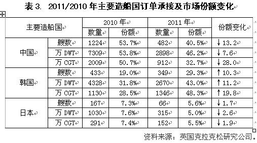 2011年世界造船仍然延續(xù)中韓兩國(guó)爭(zhēng)霸的局面,但是,市場(chǎng)需求結(jié)構(gòu)的變化導(dǎo)致兩國(guó)市場(chǎng)份額出現(xiàn)交叉變化。按克拉克松公司統(tǒng)計(jì),中國(guó)船廠承接訂單482艘、2898萬(wàn)載重噸、912萬(wàn)修正總噸,所占世界份額分別為40.5%、46.2%和32.7%,以艘數(shù)和載重噸計(jì),中國(guó)新接訂單市場(chǎng)份額仍占據(jù)全球第一,但份額較上一年分別下降13.2個(gè)百分點(diǎn)和7.6個(gè)百分點(diǎn),以修正總噸計(jì),中國(guó)市場(chǎng)份額為32.7%,較上一年下滑了28個(gè)百分點(diǎn),較韓國(guó)(48.3%)低19個(gè)百分點(diǎn),退居世界第二。