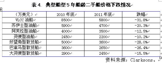 二手船市場(chǎng)對(duì)航運(yùn)市場(chǎng)的反應(yīng)較新造船市場(chǎng)更為直接,兩者存在相對(duì)同步性。國(guó)際航運(yùn)市場(chǎng)的低迷,加上船東看空后期市場(chǎng)情緒蔓延,2011年世界二手船市場(chǎng)成交水平不僅繼續(xù)延續(xù)2010年萎縮態(tài)勢(shì),而且二手船價(jià)格再度出現(xiàn)深幅下挫,船東船隊(duì)資產(chǎn)價(jià)格再度大幅縮水。統(tǒng)計(jì)表明,2011年全年共成交二手船1064艘、5121萬(wàn)載重噸,較上一年下滑了19%;典型船型5年船齡二手船價(jià)格平均跌幅在20%左右,其中,VLCC油船、好望角型散貨船和巴拿馬型散貨船跌幅高達(dá)31.8%、28.0%和26.4%,遠(yuǎn)遠(yuǎn)超過(guò)同期新船價(jià)格下行幅度。