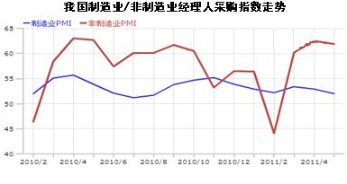 制造業(yè)PMI除3月份短暫回升以外,持續(xù)小幅回落,顯示出經(jīng)濟(jì)增速逐漸趨緩。 5月份從11個(gè)分項(xiàng)指數(shù)均有不同程度回落,其中,新訂單指數(shù)、積壓訂單指數(shù)、購(gòu)進(jìn)價(jià)格指數(shù)、原材料庫(kù)存指數(shù)回落較明顯,回落幅度超過(guò)1個(gè)百分點(diǎn),尤其以購(gòu)進(jìn)價(jià)格指數(shù)回落幅度為最大,達(dá)到5.9個(gè)百分點(diǎn) 。