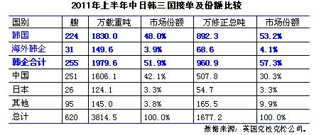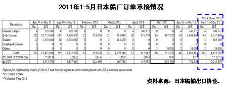 根據(jù)日本造船協(xié)會(huì)統(tǒng)計(jì),2011年1-5月日本造船業(yè)承接出口船訂單105艘、205萬(wàn)修正總噸(較克拉克松公司統(tǒng)計(jì)高出150萬(wàn)修正總噸);