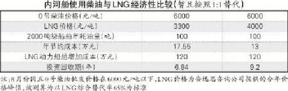 不同于歐洲內(nèi)河LNG動力船的發(fā)展,中國最早在內(nèi)河船使用LNG作為動力的嘗試來自商業(yè)嗅覺相對靈敏的民營能源企業(yè)。這些企業(yè)拿出資金對船東的內(nèi)河船進行LNG動力改造,又恰逢國家深入推進節(jié)能減排,得到一定的政府補貼。當(dāng)柴油與LNG的價格差達到2500元/噸時,使用LNG可為船東節(jié)約30%的燃料成本,按照當(dāng)時30萬~40萬元的改造成本,即便沒有政府補貼,3~4年也可通過燃料價格差收回改造成本,之后便可通過銷售LNG獲得利潤。但伴隨國家對LNG動力船標準規(guī)范的提高,改造費用增加到100萬元以上,同時柴油與LNG價格差越來越小,當(dāng)投資回收期超過8年,船東基本不會再考慮使用LNG做燃料(見表)。