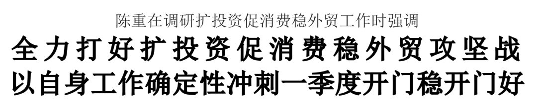 調(diào)研期間,陳重主持召開座談會,聽取擴投資促消費穩(wěn)外貿(mào)攻堅戰(zhàn)部署落實情況等匯報。他強調(diào),要加強經(jīng)濟運行調(diào)度,緊盯外部環(huán)境變化,強化動態(tài)監(jiān)測分析和科學研判,進一步找準問題癥結(jié)、拿出實招硬招,確保全市經(jīng)濟平穩(wěn)運行。要著力抓好項目謀劃招引建設(shè),扎實做好項目前期,提高項目儲備質(zhì)量,搶抓窗口期,最大化爭取資金用好政策,積極謀劃實施一批大宗樞紐領(lǐng)域重大產(chǎn)業(yè)項目,力爭更多項目列入國家專項規(guī)劃盤子;聚焦高新技術(shù)企業(yè)和專精特新項目,采取產(chǎn)業(yè)鏈招商等方式,加快招引一批大項目、好項目,特別是制造業(yè)項目,切實增強發(fā)展后勁;用好三分協(xié)調(diào)機制,做好做透要素保障,確保“千項萬億”項目按期開工。要著力推進消費轉(zhuǎn)型升級,一方面要用好政策、優(yōu)化舉措,全力提振消費市場,另一方面要打造八大服務消費新場景,積極培育康養(yǎng)消費、情緒消費、沉浸式消費、夜間消費、悅己消費,持續(xù)優(yōu)化消費結(jié)構(gòu),營造放心消費環(huán)境。要著力打好“穩(wěn)拓調(diào)優(yōu)”組合拳,精準做好重點企業(yè)幫扶,深化政企團組境外拓市場行動,充分挖掘出口業(yè)務增量,引導企業(yè)拓展“一帶一路”沿線新興市場,支持優(yōu)勢產(chǎn)業(yè)內(nèi)外貿(mào)一體聯(lián)動,加快培育外貿(mào)新動能。要結(jié)合實干爭先活動,樹牢重實干、務實功、拼實績鮮明導向,進一步強化責任落實、加強部門協(xié)同,用進度說話、用數(shù)據(jù)說話、用項目說話、用結(jié)果說話,以過硬作風保障各項工作落地見效。
